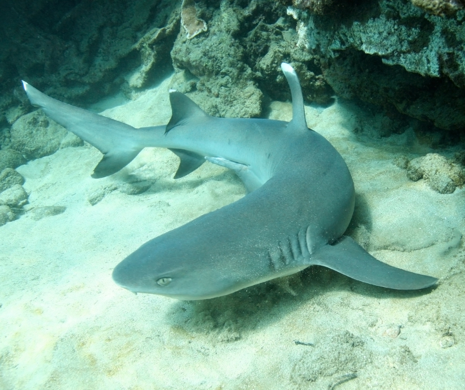 Am Aliwal Shoal lebt eine regelmäßige Gruppe von Weißspitzen-Riffhaien, die oft in der Nähe des Pinnacle Ridge - den flacheren Teilen des Riffs - anzutreffen sind. Diese kleinen, schlanken Haie ruhen tagsüber oft in Höhlen oder Spalten und sind ein regelmäßiger und friedlicher Anblick für Taucher.